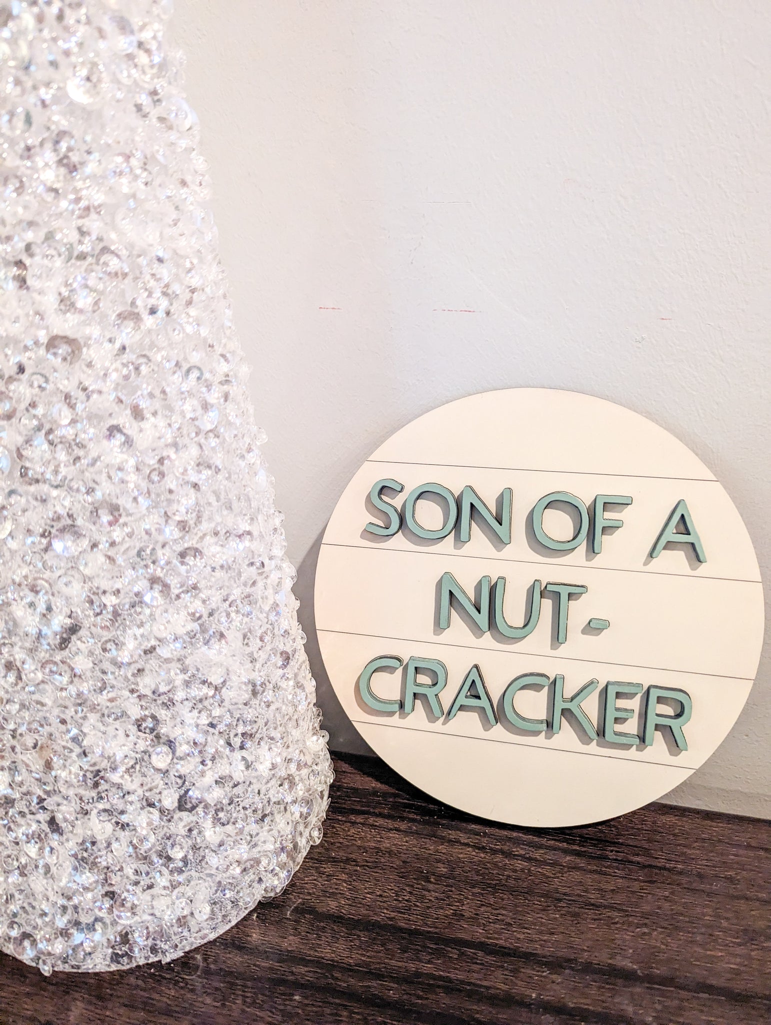 Son Of A Nut-Cracker!!!! This fun sign is the perfect humor for your Christmas decor! This sign is 8 inches, made of 1/4 in maple wood, has a backboard with engraved lines to give it that board and batten look, and the letters are 3D! We engrave an outline on our signs so it's easy to know where your letters or pieces go. You can get this as a finished sign as pictured or as a craft kit that you can run wild with and turn it into something beautiful! Please send us a picture at geoanddan1@gmail.com of your finished sign or of your sign in your home! We love to see what you create!