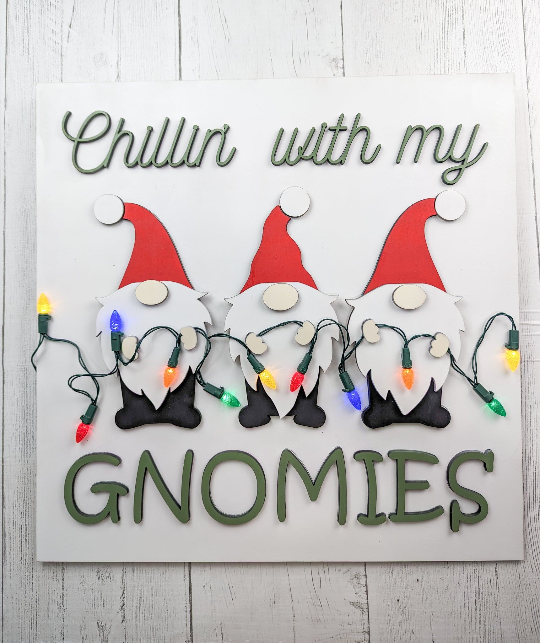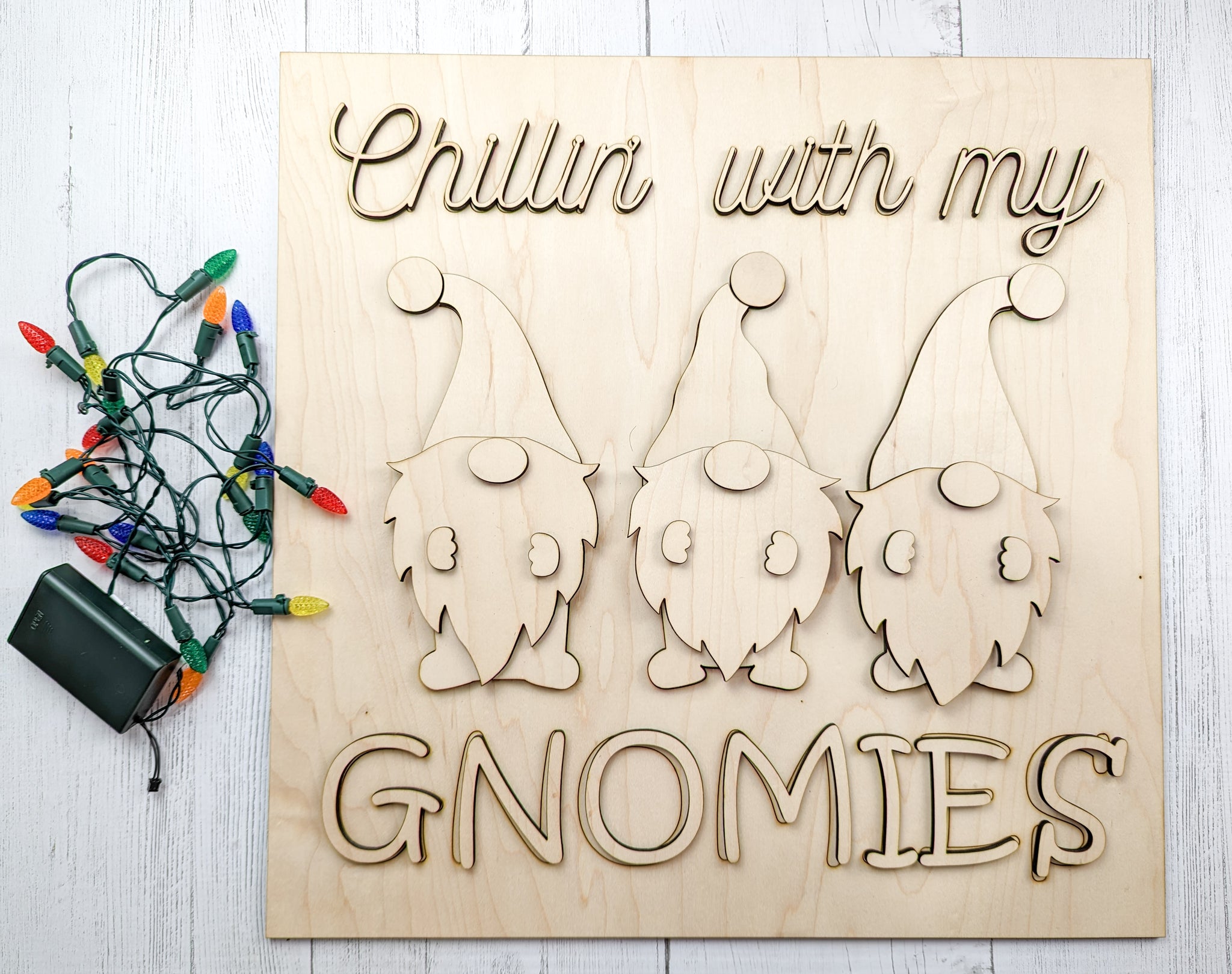 Welcome to the gnomiest place on earth! Make your cozy abode even cozier with our "Chillin' with my Gnomies" sign or craft kit. With three layers of 1/4in thick maple wood, plus real lights and a cheery design, it's perfect for adding a bit of whimsical gnome magic to your home! You can get multiple sizes of this sign as well as get a frame on it if you'd prefer. This comes as a finished sign as pictured or as a craft kit that you can finish yourself. Please send us pictures of your finished sign or of your sign up in your home for us to feature! We love seeing what you create! Send a pic to geoanddan1@gmail.com.