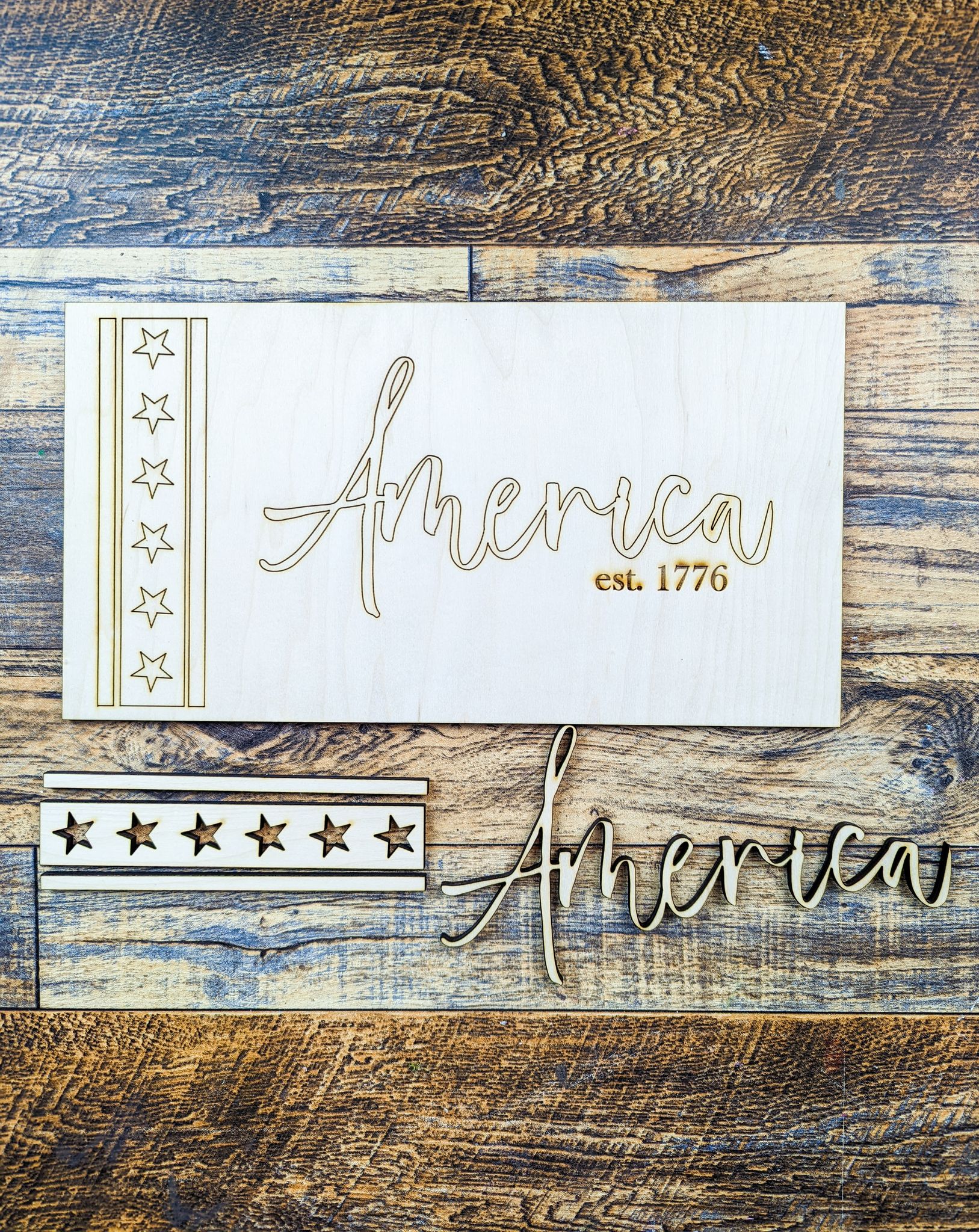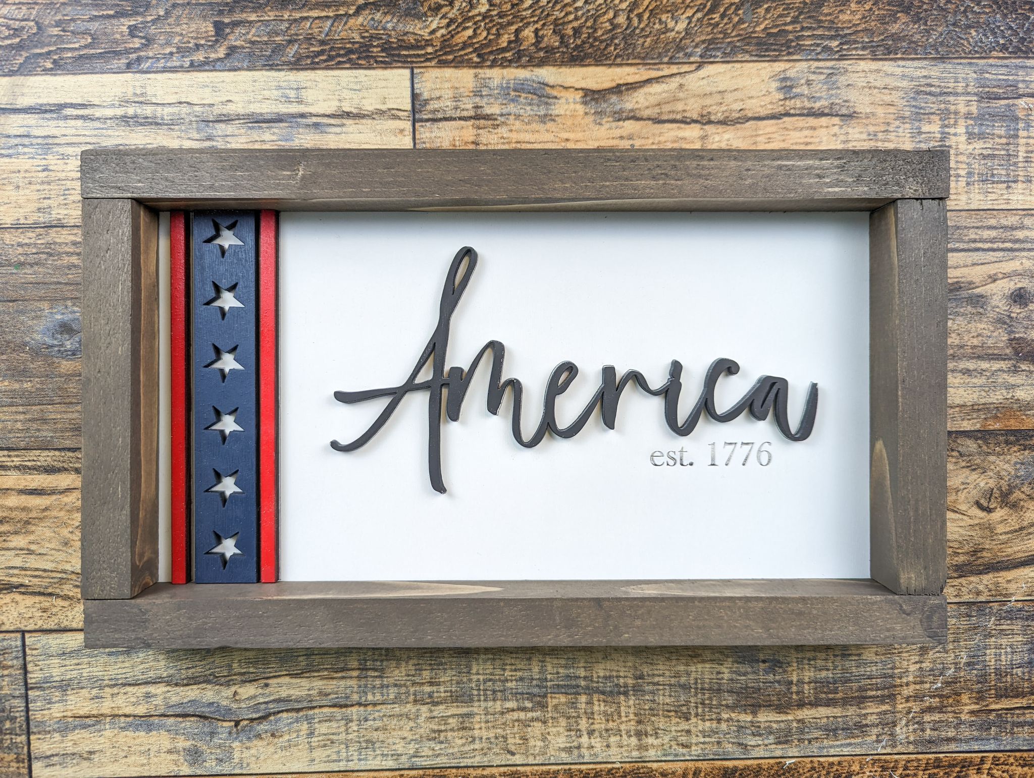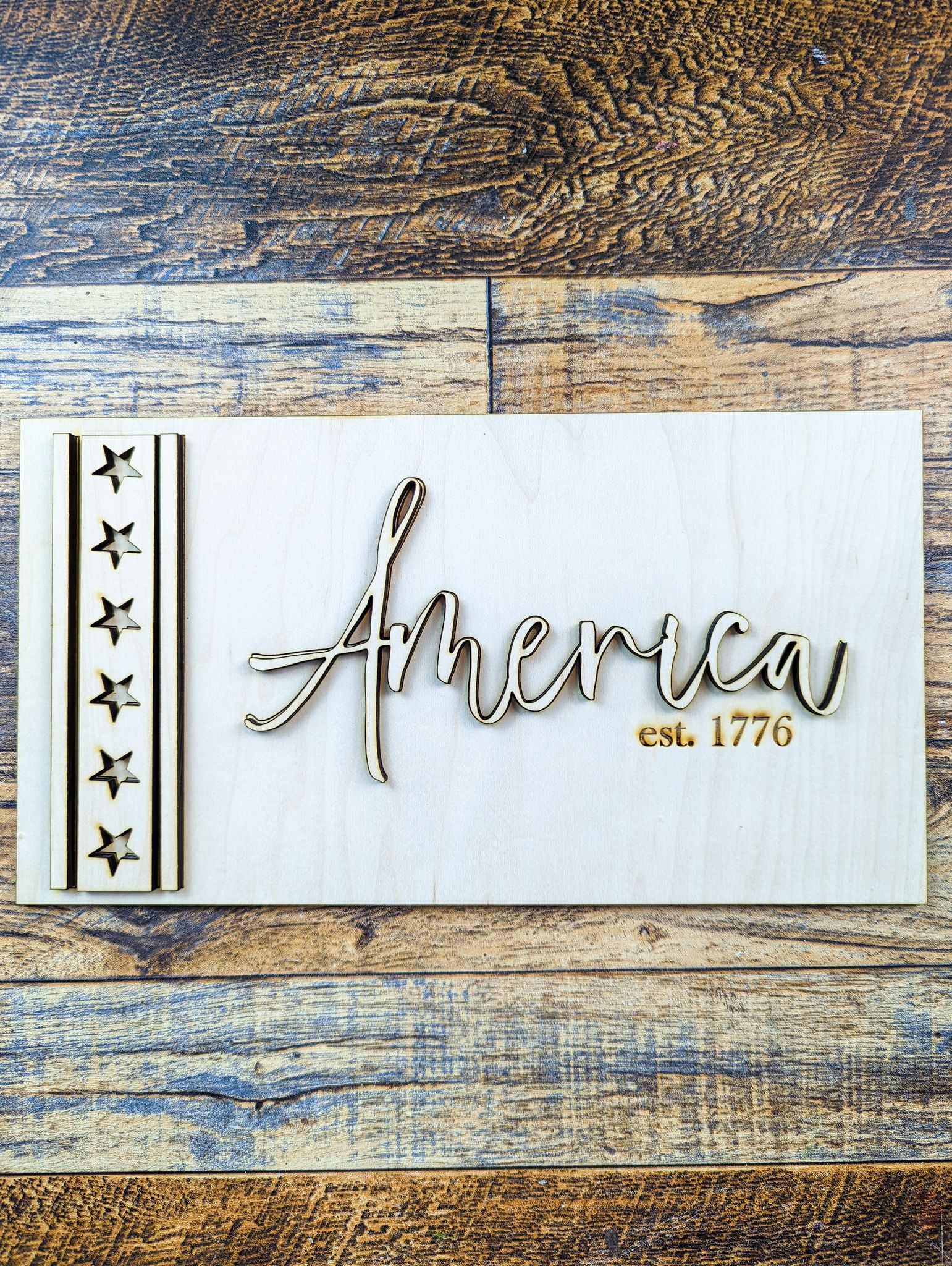 This 13in x 7.5in sign is cut from two layers of 1/4in maple as well as a frame made from 3/4in x 1.5in wood. This patriotic sign comes finished with a frame or you can purchase the craft kit and finish it how you would like.