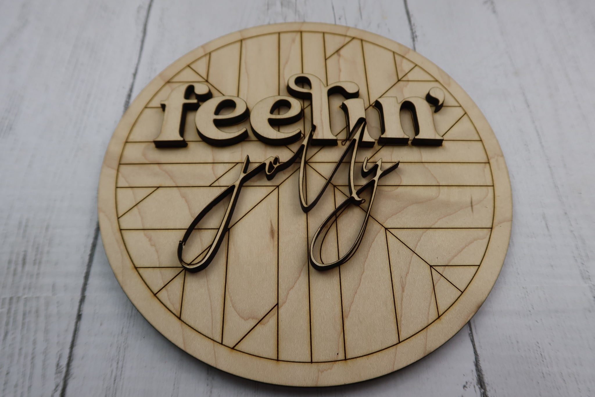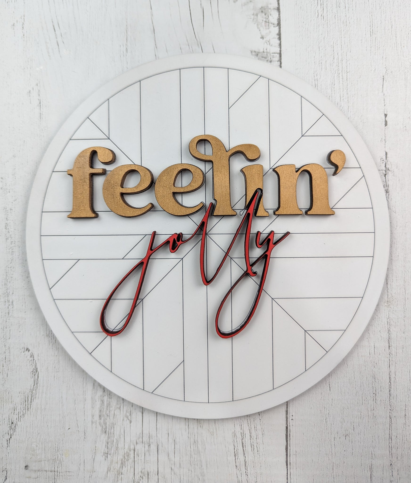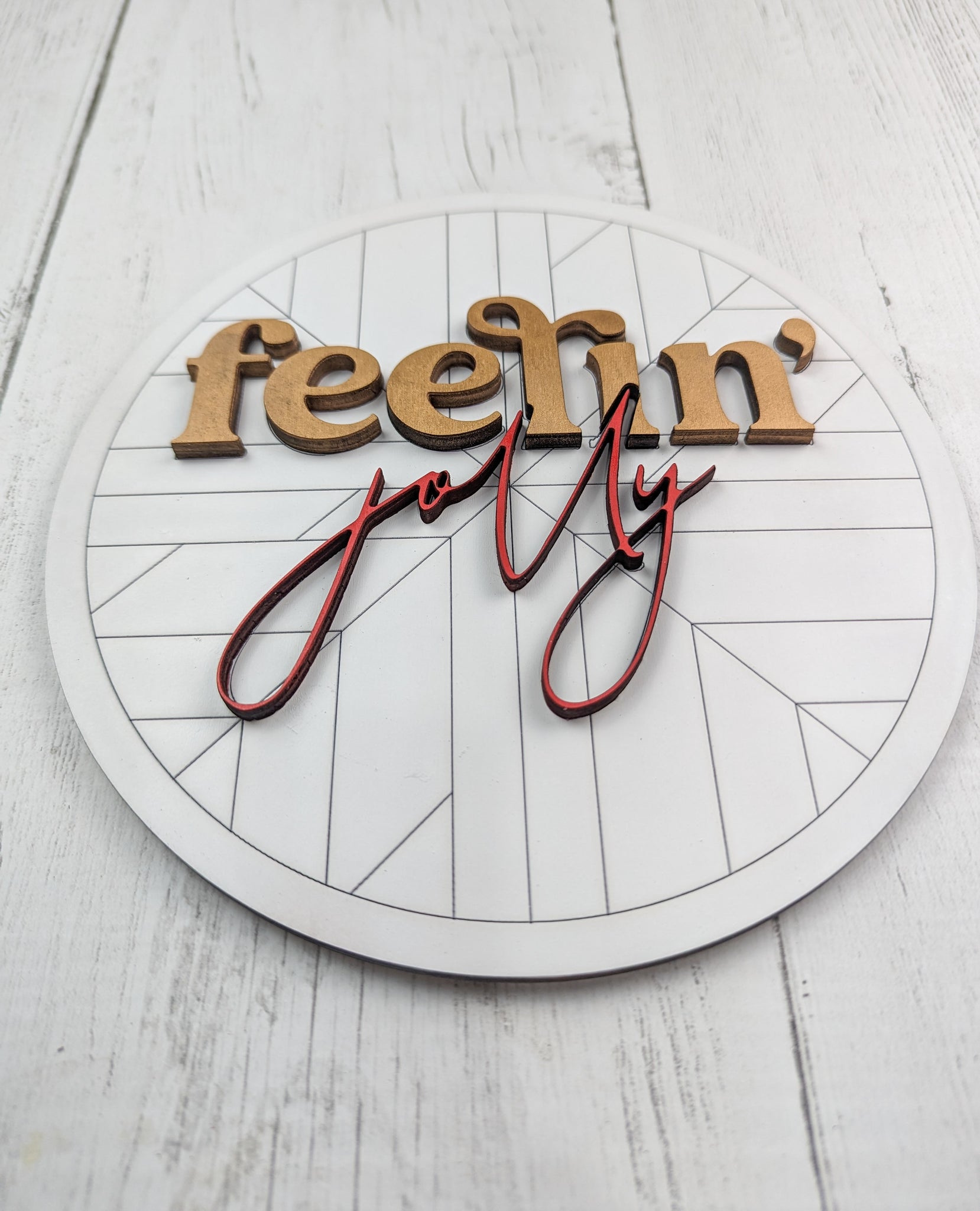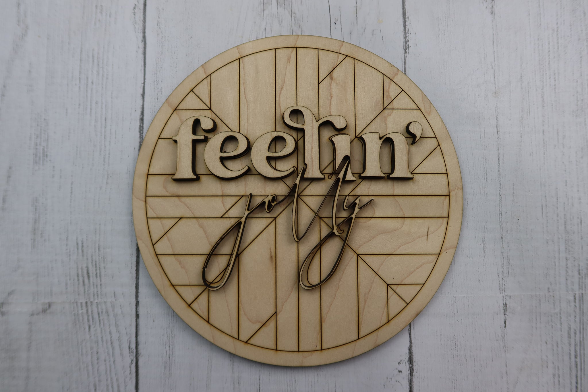 This boho Fellin' Jolly sign is sure to be the perfect addition to your Christmas decor! It is 8 inches and made of 1/4 in maple wood. The backboard is engraved with the most adorable pattern and the letters are 3D so you can glue them to the baseboard. Our kits come with an engraved outline so you know where exactly to place your letters and it makes crafting so much easier! This can come as finished like pictured or as a craft kit that you can finish yourself! Please send us a finished picture of what you created with your sign to our email at geoanddan1@gmail.com. We love seeing what you come up with!