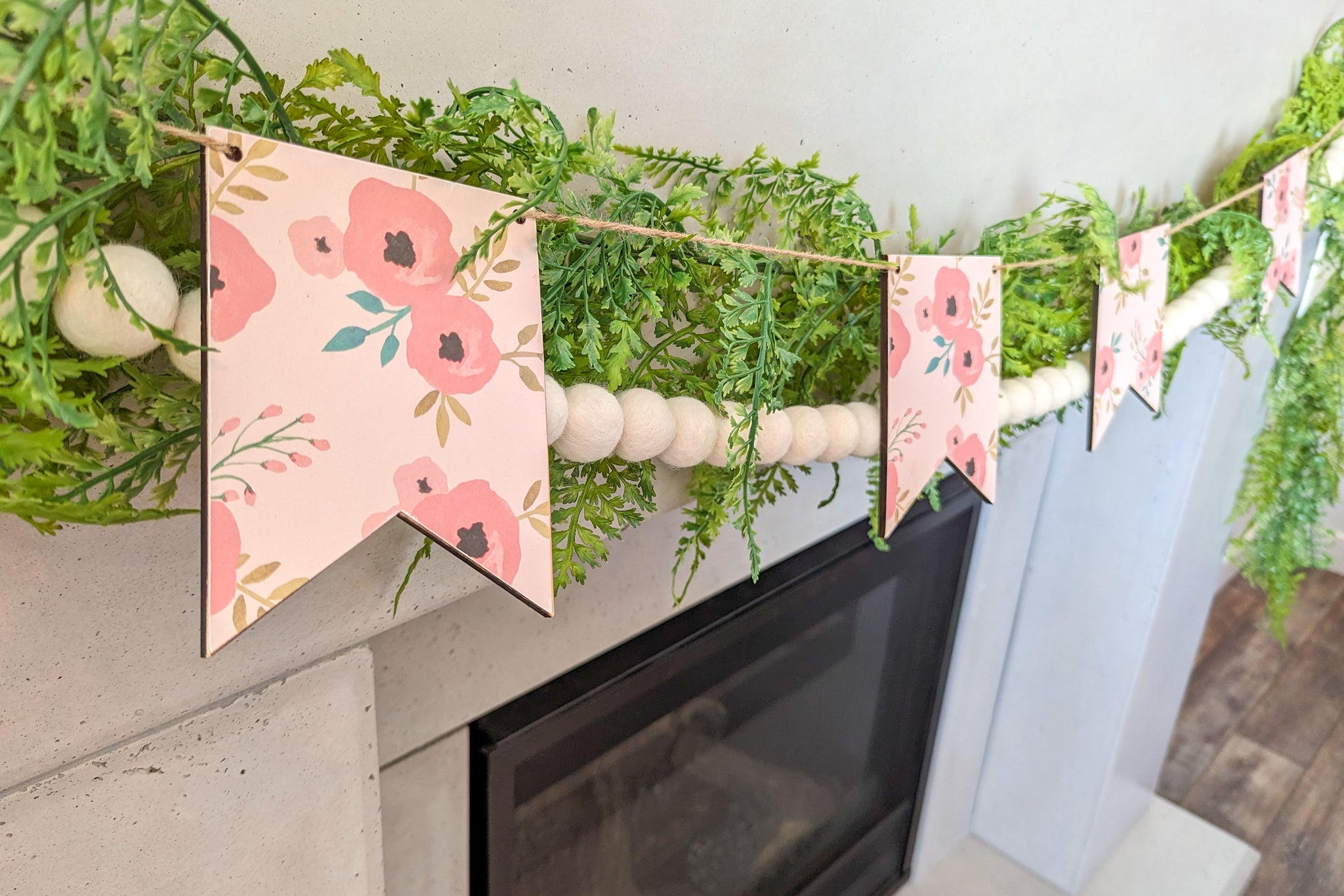 This gorgeous pink floral pennant garland will be adorable in any room you choose to use it in whether that is in your living room or a nursery! It is so versatile! This garland is made with 5 wooden pennants made with 1/4 in Maple wood and has pink floral paper applied on top. This garland is 5.5 ft long.