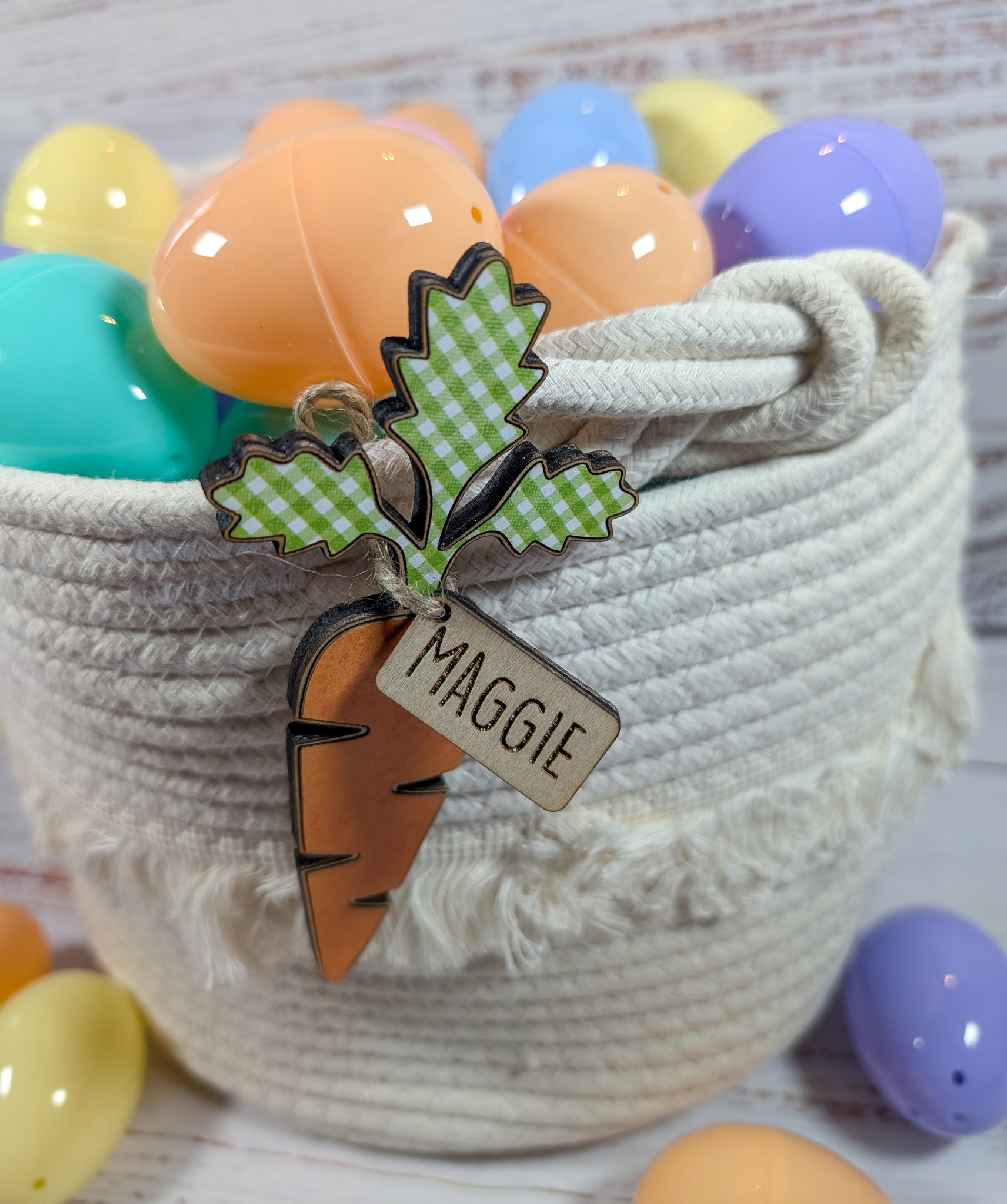These beautiful carrot Easter Basket name tags are the perfect addition to your kids' Easter baskets this year! They are 5.5 x 2.5 in. How many times in the past have you gotten your kids' baskets confused?! Just me?! You get these finished as pictured or as a craft kit for you to finish yourself. The kit comes with the wooden cut-out carrots, scrapbook paper that is laser engraved to fit perfectly on your wooden pieces, a laser engraved wooden tag with a name on it, and twine to tie onto the basket. It's such a fun craft to do on your own and pretty simple to assemble. Please message me if you have questions. Please read carefully that you are choosing a finished product or an unfinished product so you aren't shocked when it's unfinished and you wanted it finished! Please put the names you want in the personalization box as well if you have any requests. The basket and eggs are not included and this is priced for one tag.