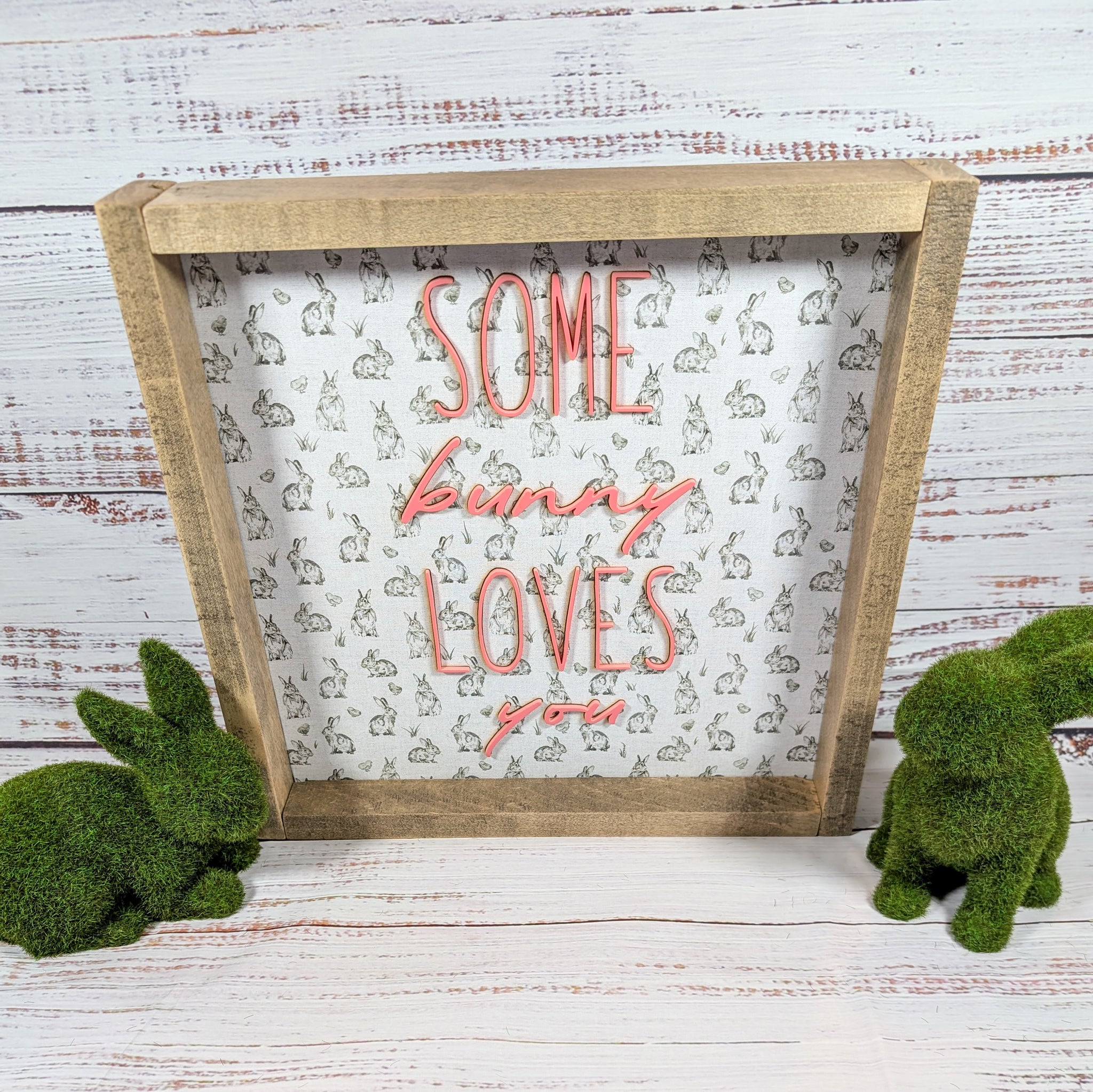 Make sure to add this cute Some Bunny Loves You sign to your Easter decor this season! The pink 3D acrylic words bring something extra and special, and the bunny background is to die for!! It's definitely my favorite part! We are happy to customize it to your liking just comment any personalization you'd like, and we can chat about what you want. This sign is framed and stained with briarsmoke stain. The laser-cut wood on the back is 1/4 in maple wood. Don't miss out on this beautiful sign!! Please make sure to read carefully to understand their are 2 options one with a frame, one without before you buy.