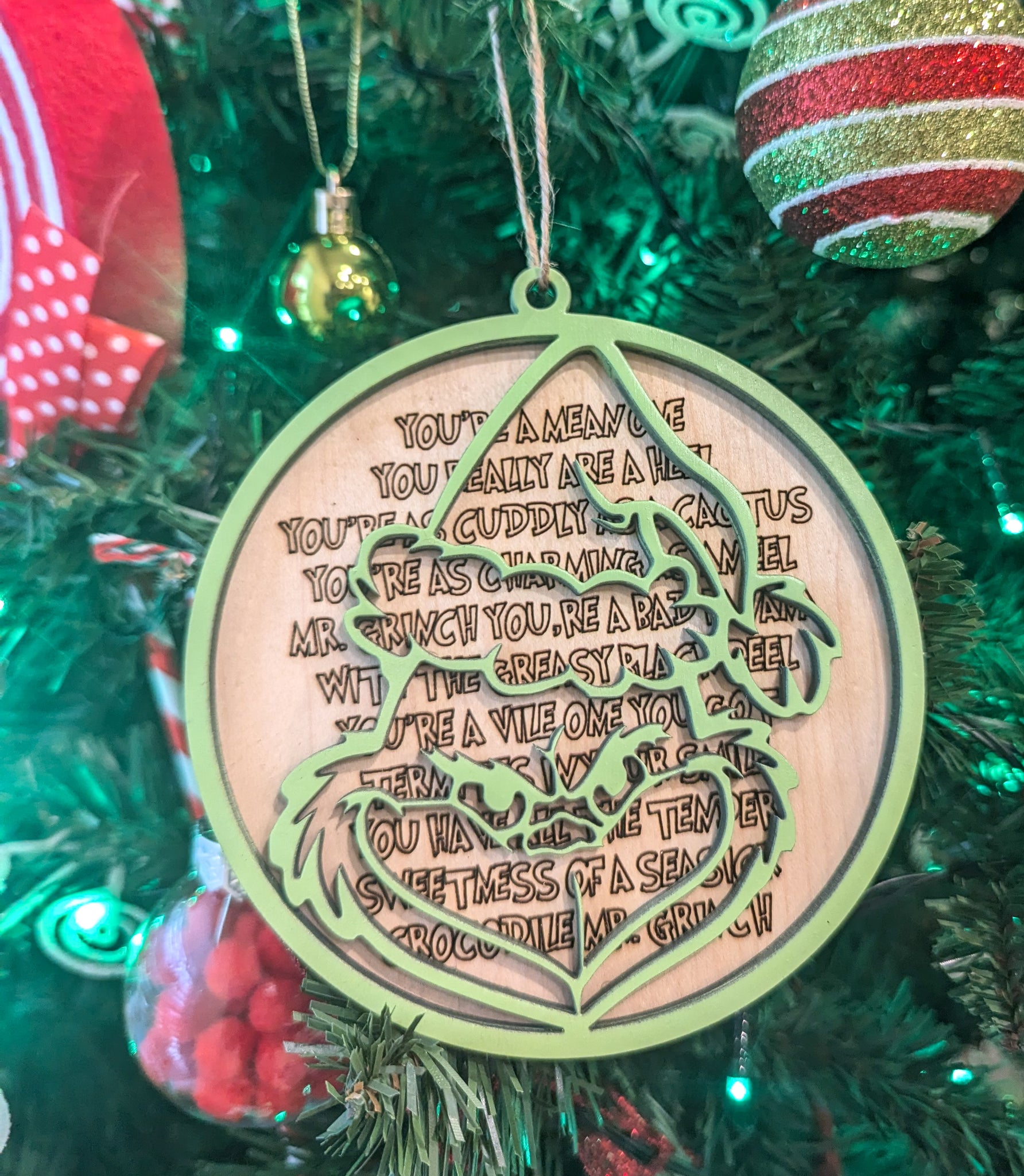We handmade these adorable Christmas ornaments. We love the engraved song lyrics behind the Grinch; it brings the ornament more to life! You can get this finished as pictured or unfinished so you can finish it how you would like. The ornament is 5 inches. It's the perfect piece to add to your Christmas tree and would be a perfect Christmas gift!